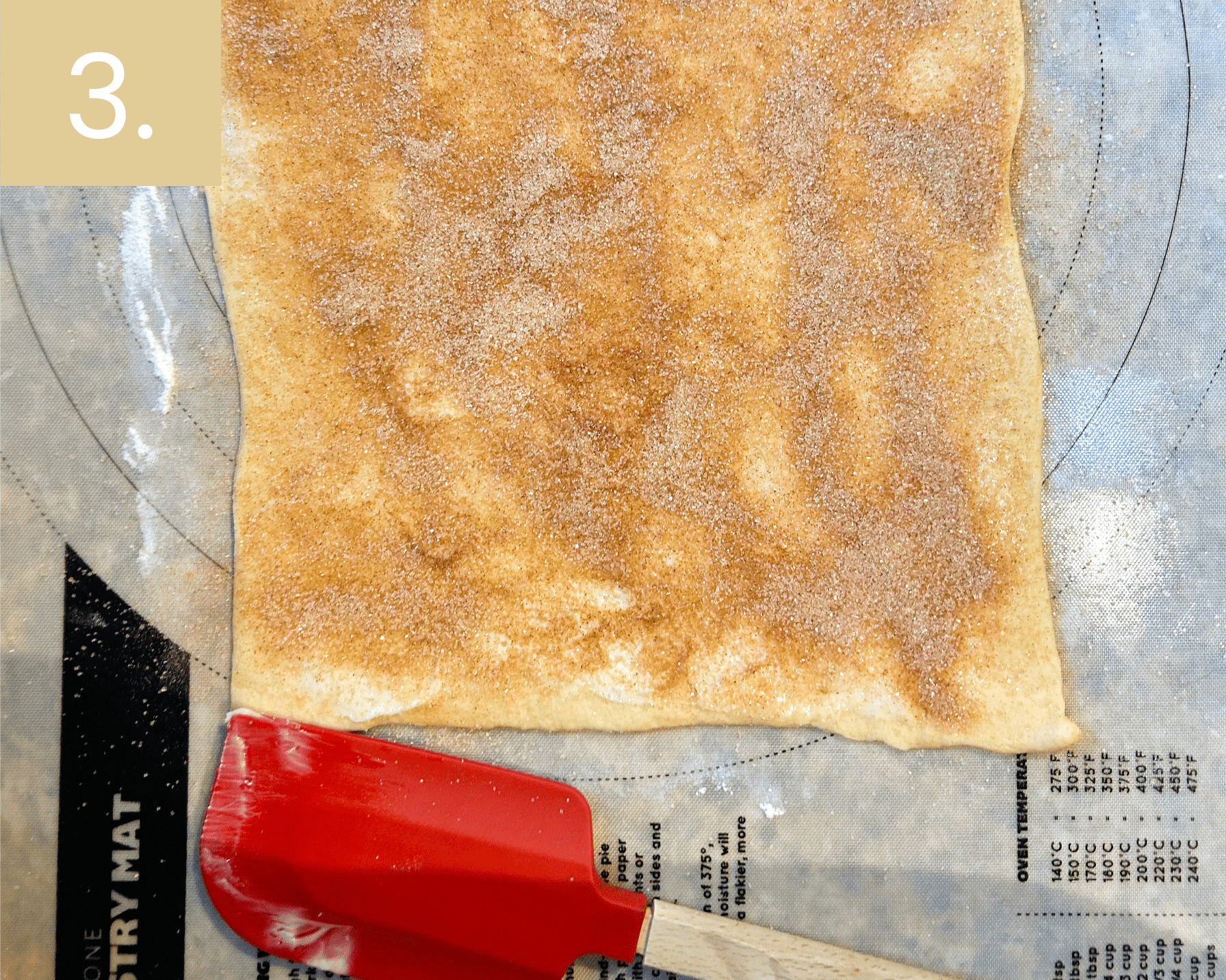 Step 3 – Cinnamon sugar. Sprinkle generously with your cinnamon sugar mixture. No bald spots. Cover the whole thing. Add extra. Have fun.