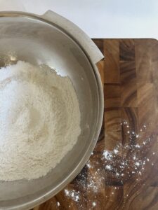 - In a medium bowl, measure out the dry ingredients and whisk together the flour, baking powder, and salt.1½ cups all-purpose flour, 1½ teaspoons baking powder, ½ teaspoon salt